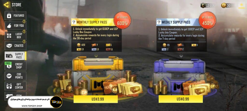 خرید ساپلای پس کالاف دیوتی هفتگی، فرصتی برای بازیکنان است تا با پرداخت مبلغی ناچیز، جوایز و آیتمهای منحصر به فردی را دریافت کنند. با خرید supply pass کالاف دیوتی موبایل هفتگی، 7 روز زمان دارید. به این معنا که در مدت یک هفته، به آیتمهای مختلفی مانند اسلحههای جدید، پوستههای شخصیتها و... دسترسی خواهید داشت. قیمت ساپلای پس هفتگی ارزانتر از ساپلای پس ماهانه است.